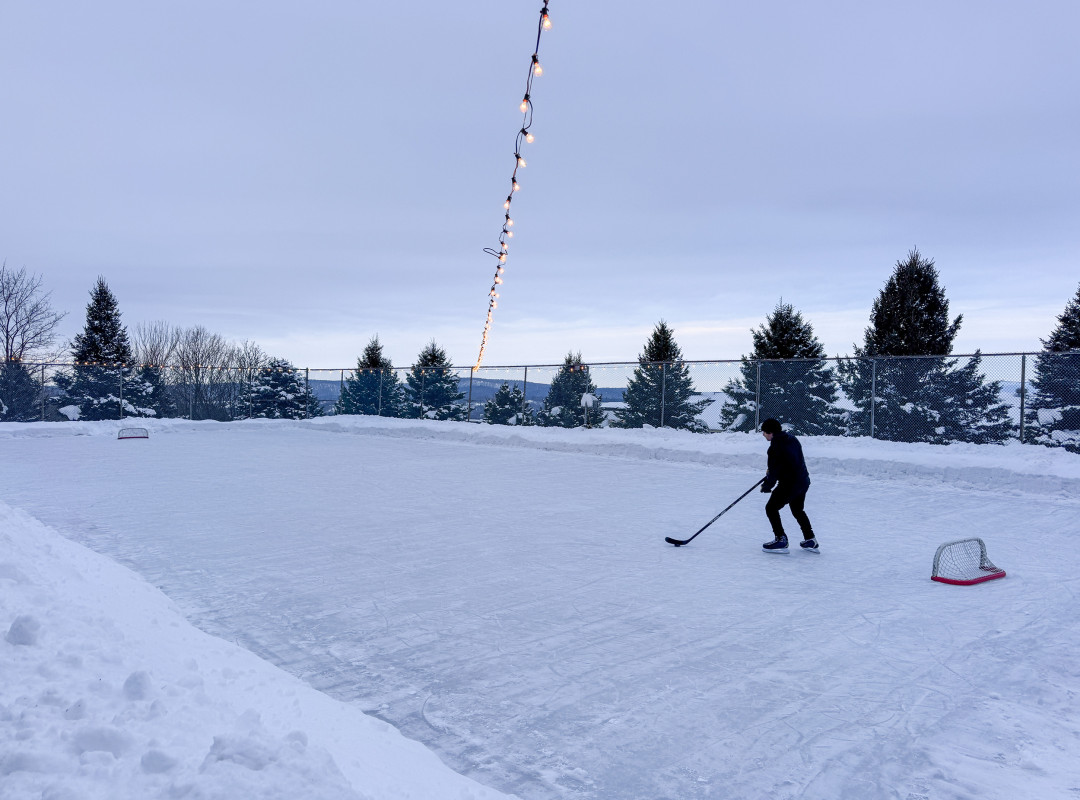 Après s’être installés dans notre confortable habitation parfaitement équipée, on s’est disputé une sympathique partie de hockey en famille sur la magnifique patinoire éclairée de l’Hôtel Horizon, à même le domaine d’Huttopia Sutton. Autre plus lorsqu’on séjourne ici? On peut profiter gratuitement des sentiers de Plein Air Sutton, qui prennent leur départ à quelques pas de nos hébergements.