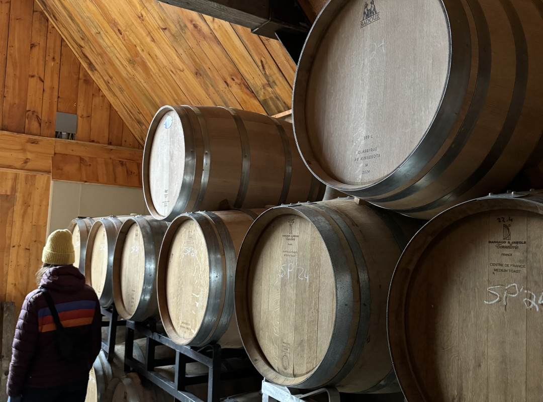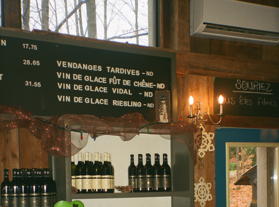 At Léon Courville, Vigneron, we’re instantly charmed — by the smell of freshly made mulled wine and the warm welcome from the staff. During the colder months, the tasting room transforms into a cozy chalet where guests can sip wine and play board games by the fire.