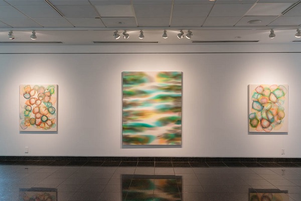 The exhibition Crues is a body of work produced by Luce Meunier over the past ten years. Curated by Sylvie Lacerte, the paintings were created almost haphazardly. Like a bystander, Luce Meunier does not attempt to manipulate the result of her work. Rather, she allows the colours to flow quite naturally on to the canvas. When the snowballs melt and with the passage of time, the resulting images emerge organically – sometimes in the form of pale, diluted patches of colour and sometimes in blurry designs. The effect of time is an important aspect of Meunier’s work because, like a scientist, she experiments with colour and records her observations.